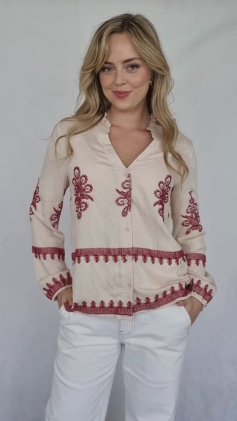 This charming blouse features a relaxed fit and long sleeves, crafted from a lightweight, cream-colored fabric. Delicate red embroidery adds a touch of bohemian elegance, with stylized floral motifs and border details creating a sophisticated and subtly eye-catching design. The overall aesthetic is both relaxed and refined.