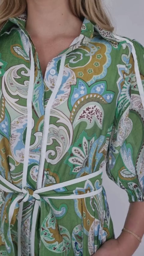 This enchanting maxi dress showcases a vibrant paisley print on a rich green, creating a sophisticated bohemian aesthetic. The three-quarter sleeves, collared neckline, and self-tie belt add refined details, while the tiered skirt lends a touch of whimsical charm. The subtle white piping along the seams provides a clean contrast, enhancing the overall elegance of the design.