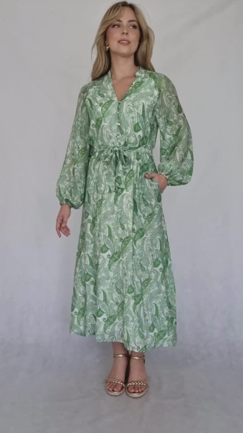Adorned with a delicate green paisley print, the flowing silhouette and cinched waist flatter your figure. The sophisticated design is perfect for both daytime and evening events. Exude confidence and grace in this refreshing dress.