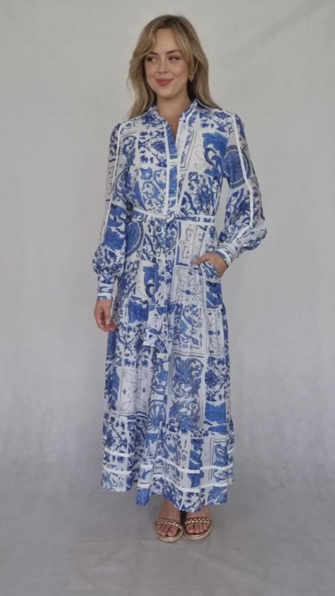This elegant maxi dress features a captivating blue and white porcelain print, reminiscent of classic Delftware. The long sleeves, collared neckline, and cinched waist create a flattering silhouette, while the flowing skirt adds a touch of effortless grace. The intricate detailing of the print elevates this piece from casual to chic, making it perfect for a variety of occasions.