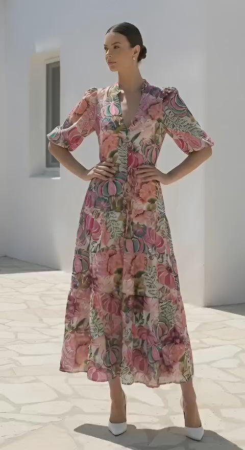 This maxi dress is a vibrant celebration of color and print. The flowing skirt and three-quarter sleeves create a romantic silhouette, while the bold floral pattern in shades of pink, red, and blue adds a touch of bohemian flair. The cinched waist creates a flattering shape, and the overall design is both playful and sophisticated.