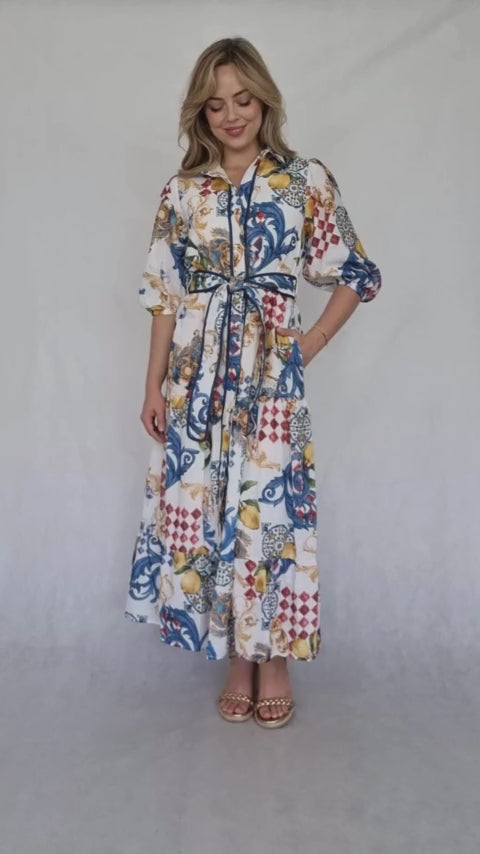 This maxi dress is a vibrant and cheerful piece, reminiscent of Italian majolica pottery. The white base is adorned with a lively print of blue, gold, and red patterns, interspersed with lemons and other motifs. The three-quarter sleeves, collared neckline, and belted waist create a flattering and feminine silhouette. The dark trim adds a touch of contrast and sophistication, making it a perfect choice for summer occasions.