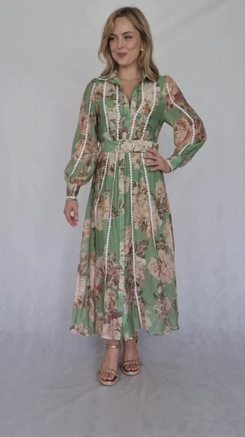 This midi dress is a beautiful blend of romantic and modern styles. The flowing silhouette is adorned with a delicate floral print in soft blush and cream tones on a sage green. Long sleeves, a collared neckline, and a defined waist create a flattering shape. The subtle pearl trim adds a touch of refined elegance, while the asymmetrical hemline lends a contemporary twist