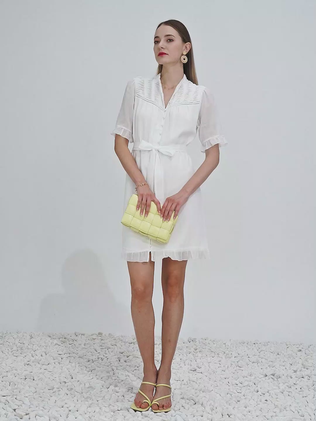 Sophisticated and timeless, Rochelle Linen Short Dress will add a touch of elegance to any outfit. Crafted from beautiful lightweight linen this stunning women's dress features a functional button-up front, romantic ruffle cap sleeve, pleat detail yoke and delicate lace insert details. A gorgeous addition to your wardrobe, you'll love how versatile this style is